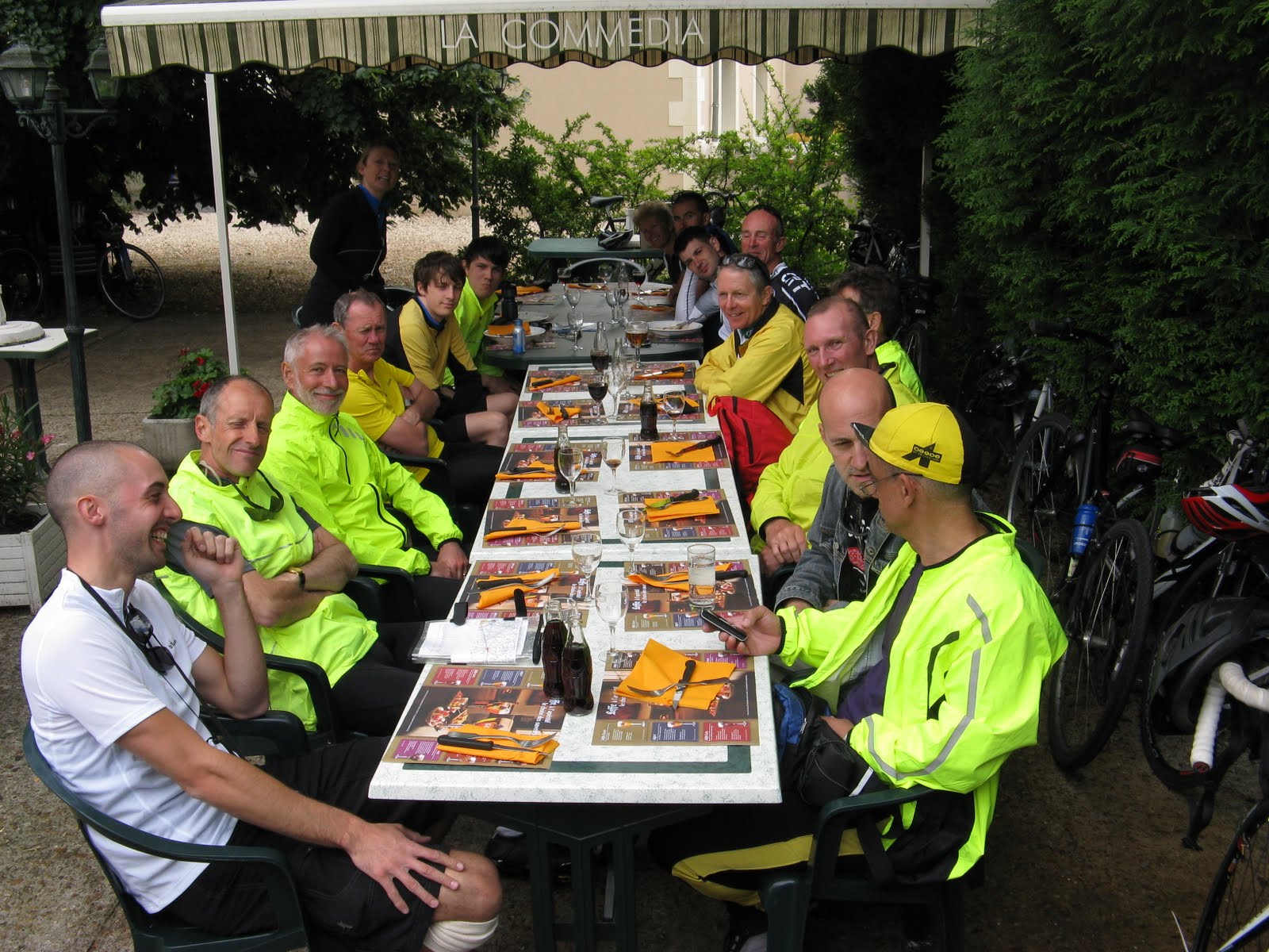 We had little choice today but to follow a busy D road practically all the way. It was straight, busy but fast and smooth. The terrain was flattish all day but still interesting. We crossed the Loire at Blois - a city I remember from 30 years back. Great, grand architecture - palatial, regal buildings but we had no real time to explore as we were doing best part of 90 miles. Over the river things gradually quietened down and the grey skies gave way to sun for a while. Still remained cool with a northerly tailwind which continued to help us maintain decent speeds. Lunch at Selles sur Cher - pizza all round, pretty good too, even if Madame was less than impressed by our late arrival ( e.g. after twelve thirty!). All was good until Valencay, thirty miles from the end when James had accident number two, falling off and dislocating his shoulder. This time meaning an ambulance to A&E in Chateauroux. Actually this was a massive disappointment for him which was a real shame - as although it was fixed it meant the end of the cycling pretty much for him. Stayed at the Hotel Amarys which although being a chain was good, really friendly and just what we needed. Rarely enjoyed a cold beer as much. C U tomorrow for more!